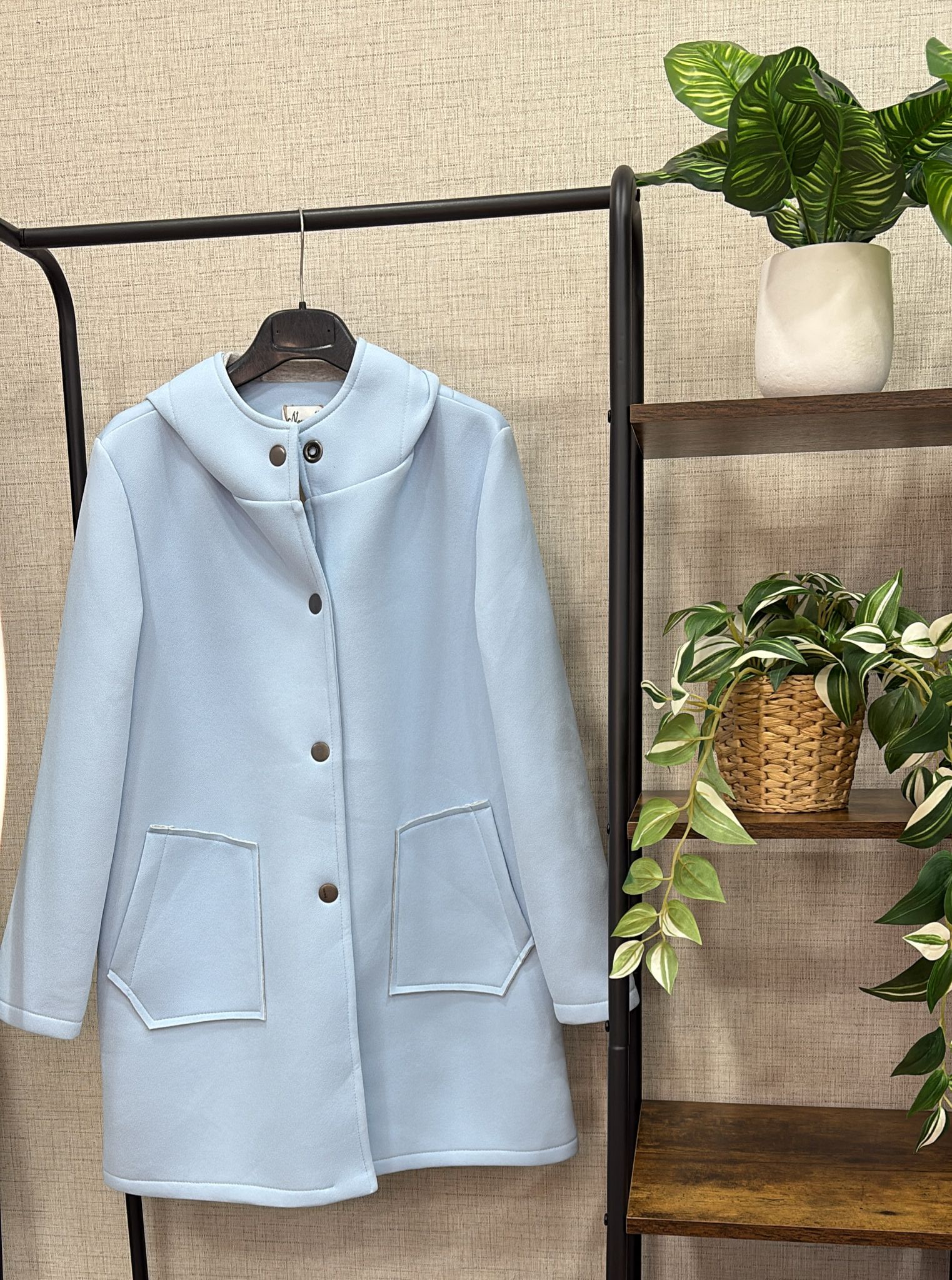 Abrigo de neopreno con choto, bolsillos y contraste en color gris en el interior.