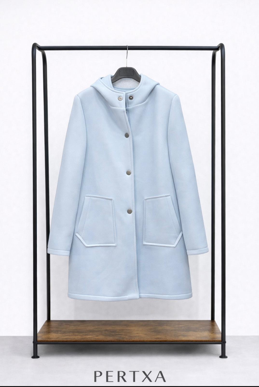 Abrigo de neopreno con choto, bolsillos y contraste en color gris en el interior.