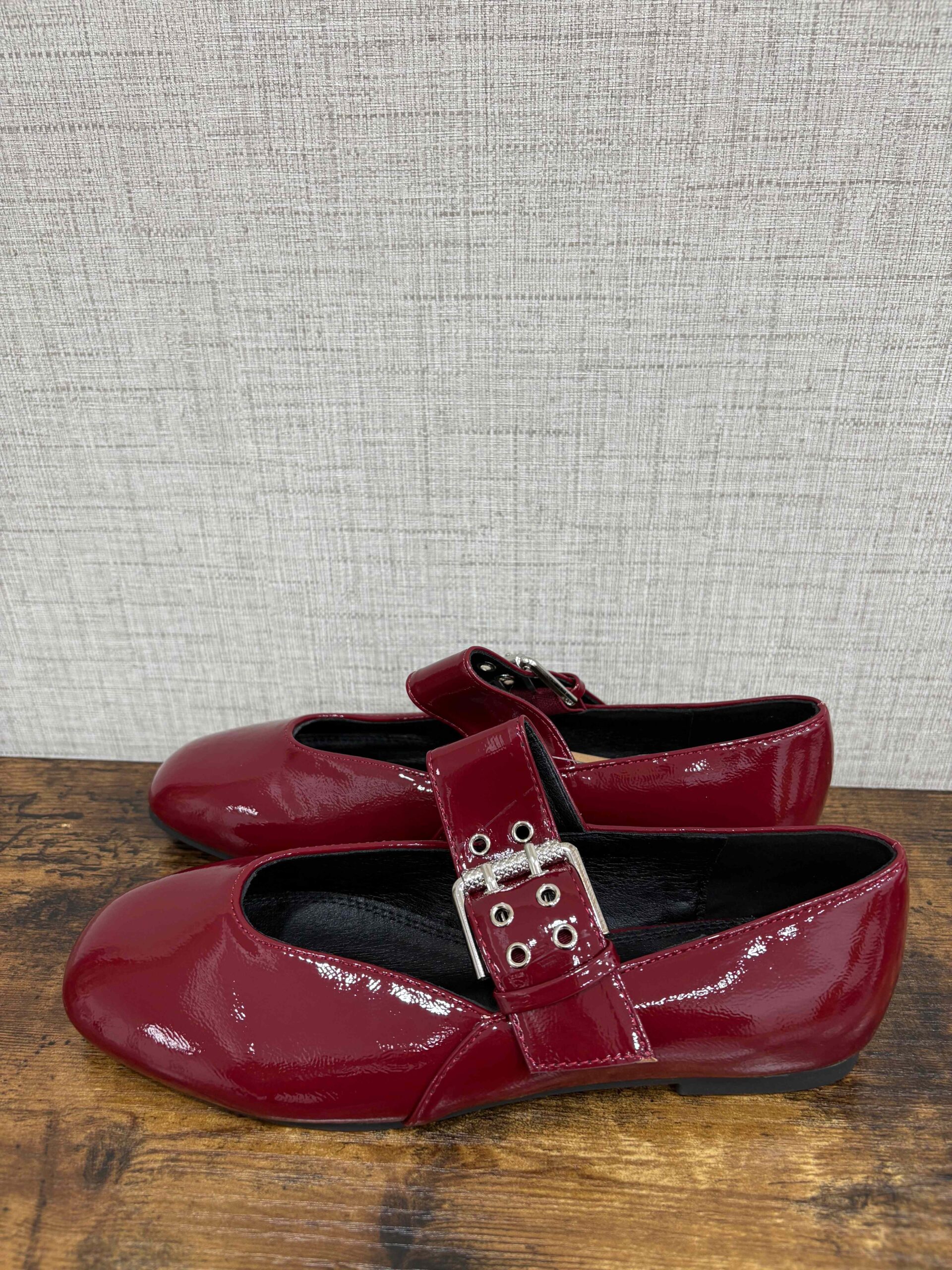 Bailarinas acharoladas en color vino, elegantes y versátiles. Planas y con cierre de hebilla para un ajuste cómodo y seguro, ideales para aportar un toque sofisticado a tus looks diarios.