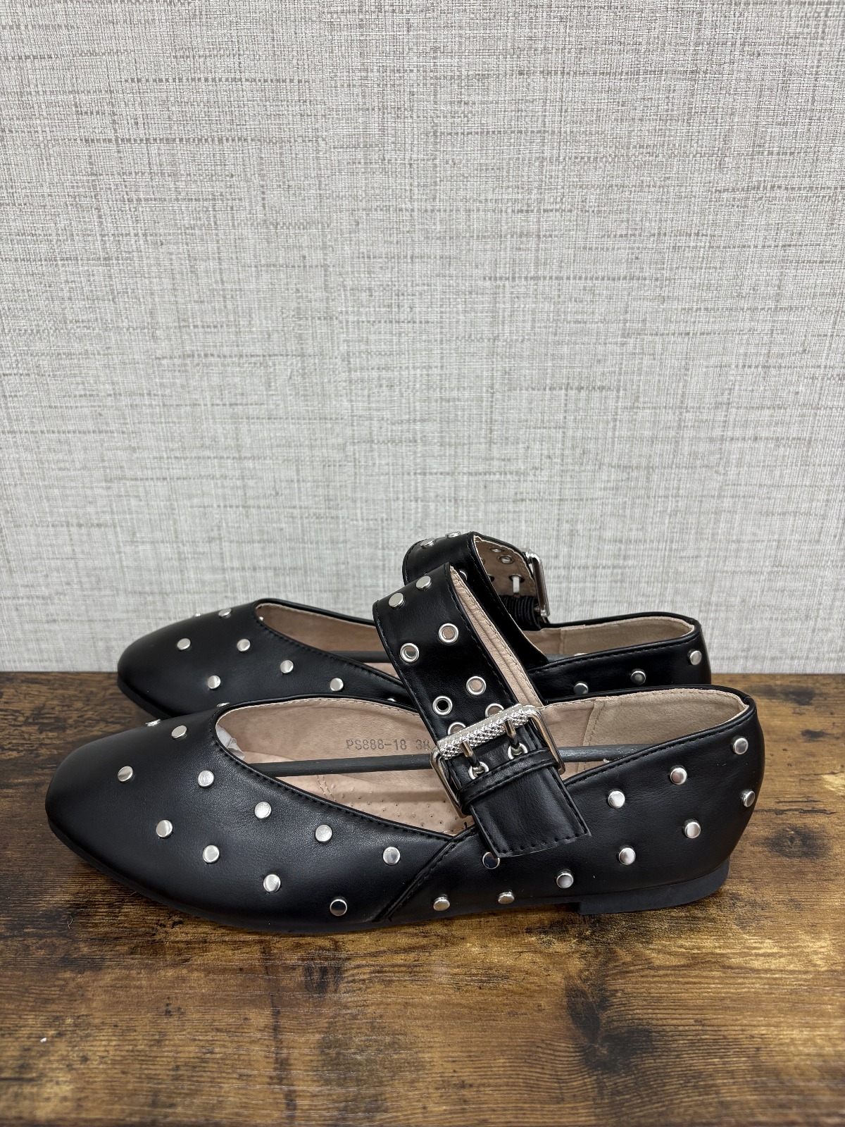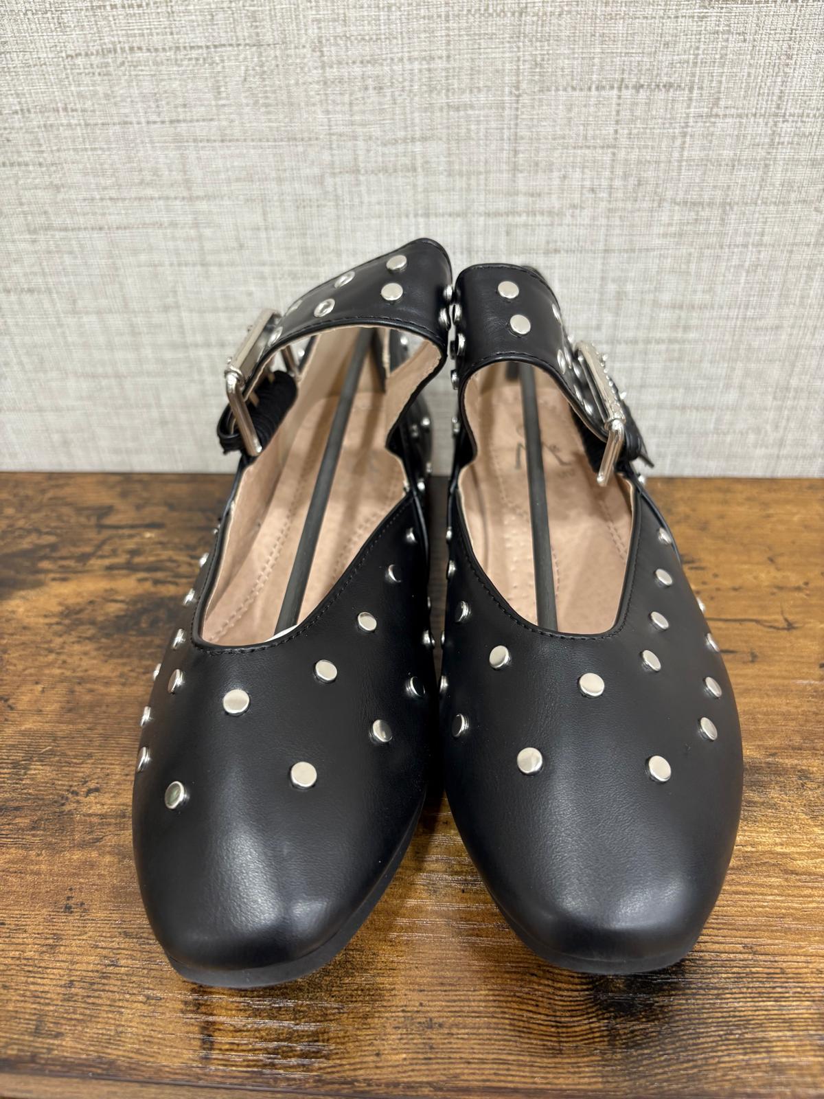 Bailarinas de piel sintética, de estilo moderno y elegante. Planas, con cierre de hebilla para un ajuste seguro y detalle de tachuelas que aporta un toque actual y sofisticado.