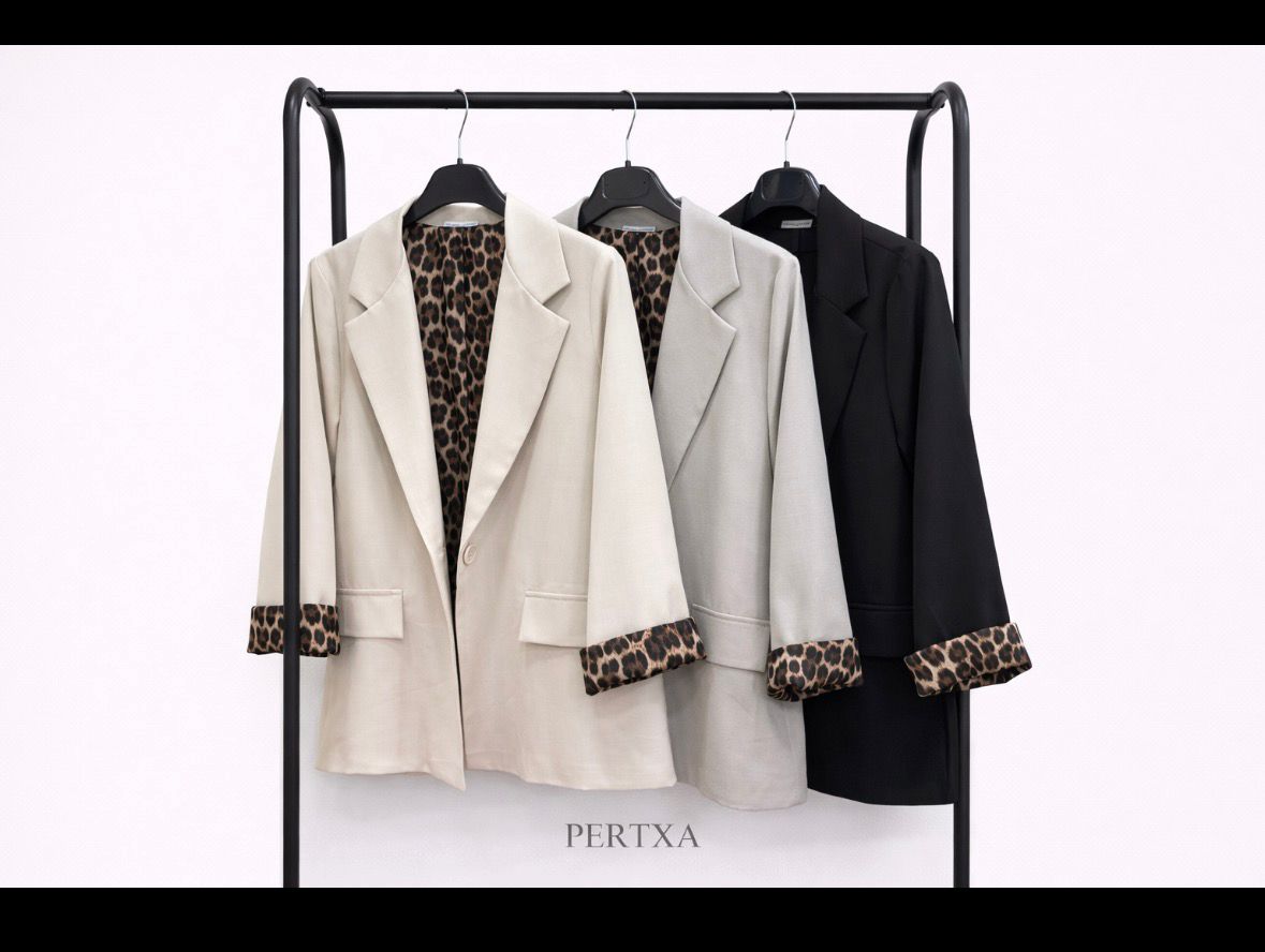 Blazer de poliéster con diseño elegante y versátil. Cuenta con forro interior con print animal, que aporta un toque moderno y original. Talla única, se adapta cómodamente hasta 100 cm de contorno de pecho.