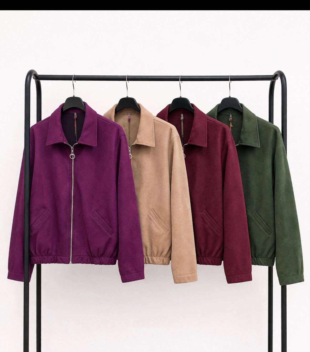 Bomber de antelina, suave y estilosa, con cierre de cremallera y goma en el bajo para un ajuste cómodo.