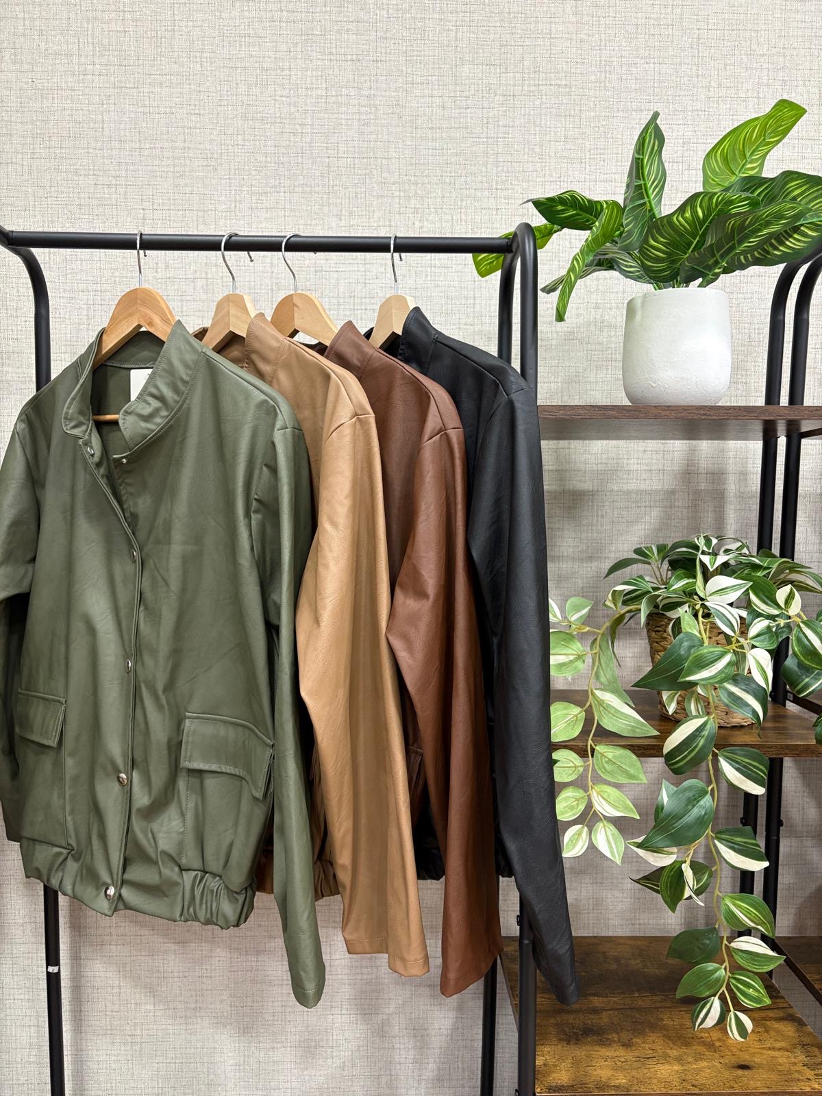 Bomber de polipiel, moderna y versátil, con cierre de botones, goma en el bajo para un ajuste cómodo y bolsillos frontales funcionales.