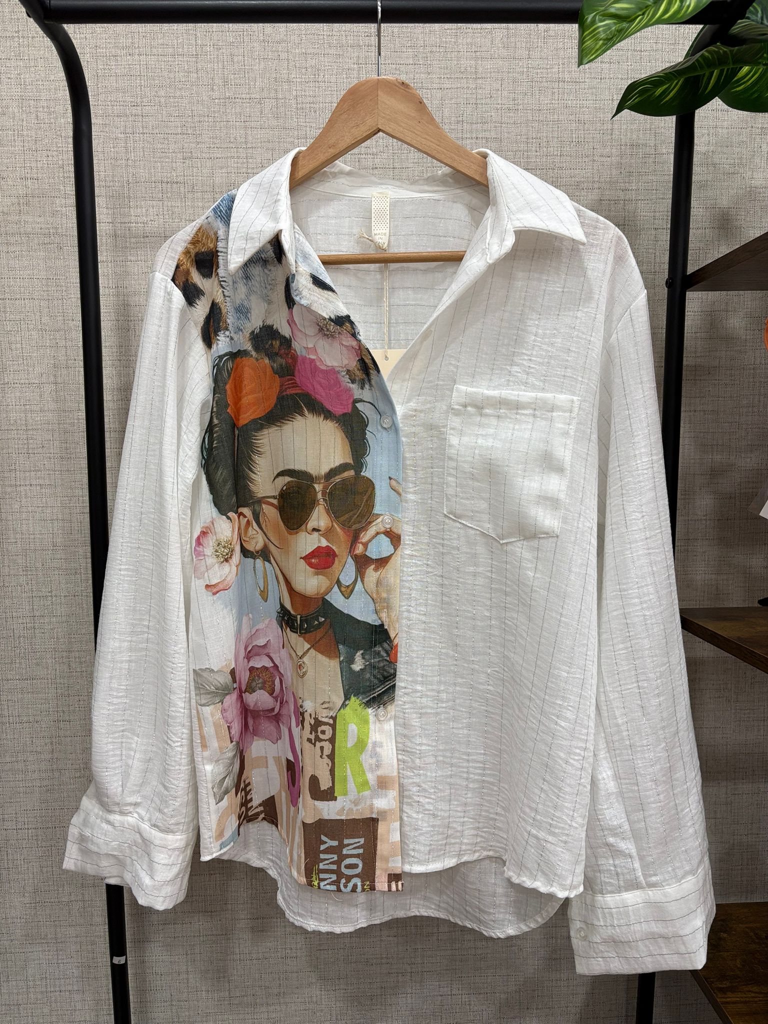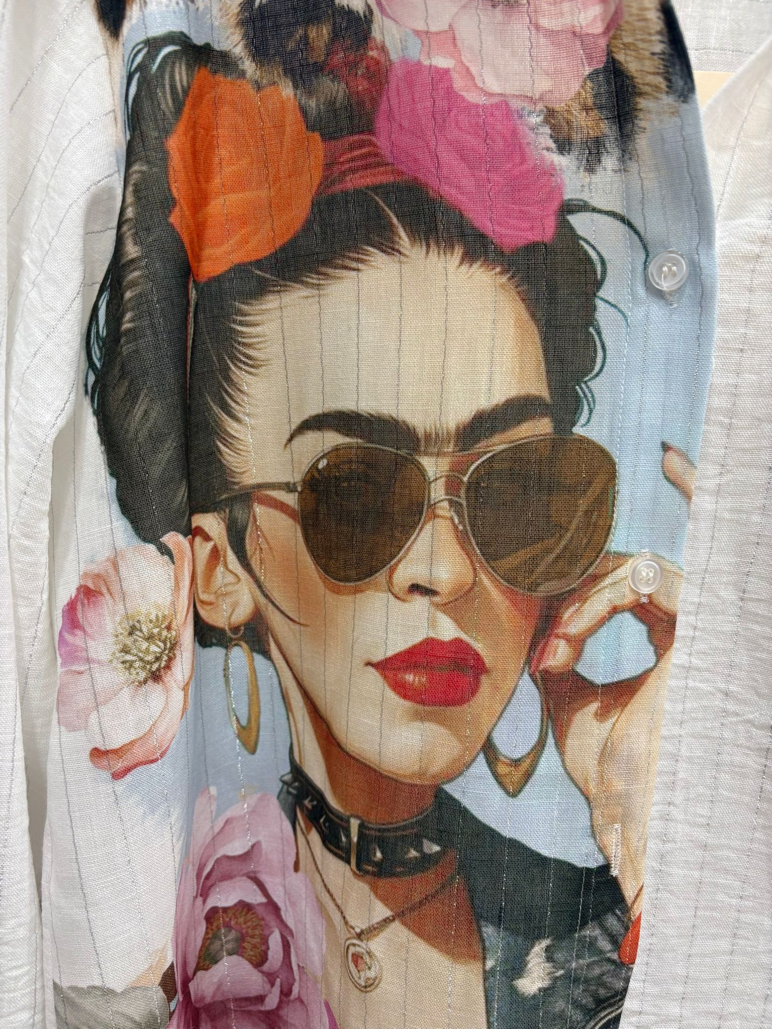 Expresa tu personalidad con esta original camisa con ilustración inspirada en Frida Kahlo. Una prenda con carácter que fusiona arte y moda en un diseño único y lleno de fuerza.
