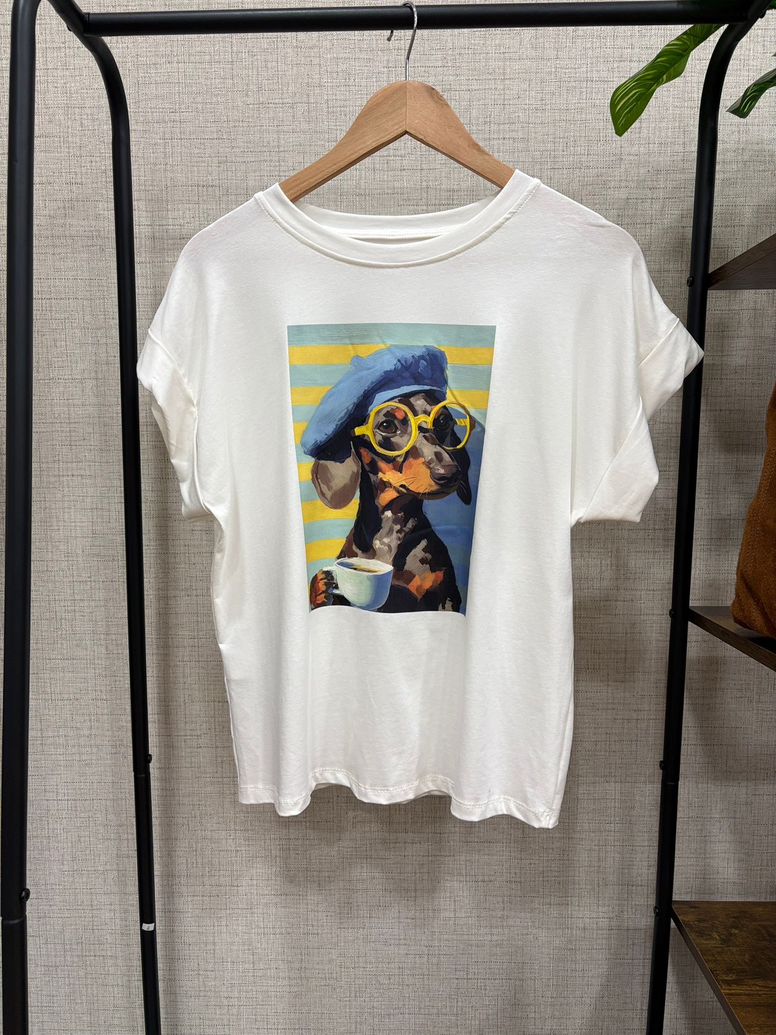 El diseño destaca por su ilustración detallada de la cara de un perro, logrando una expresión tierna y realista que aporta personalidad y estilo a cualquier outfit. Perfecta para combinar con jeans, shorts o looks casuales.