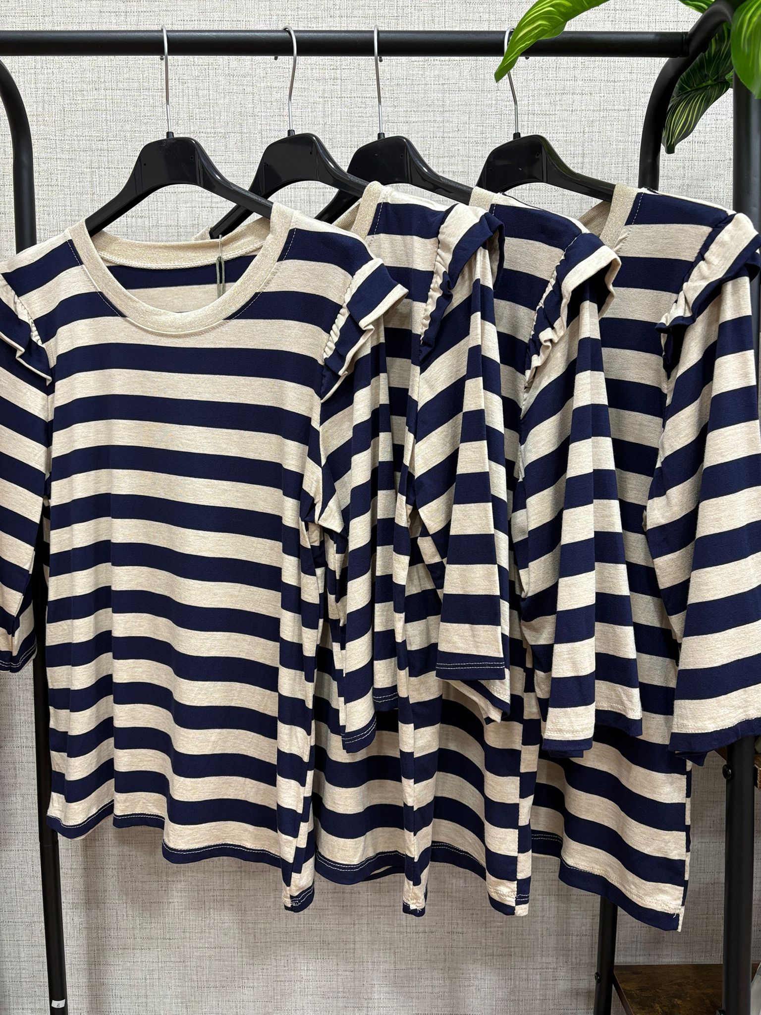 Camiseta en color navy confeccionada en una suave mezcla de viscosa y elastán que se adapta cómodamente al cuerpo. Diseño de manga francesa que aporta un toque elegante y versátil, perfecto para el día a día. Destaca el detalle de volante en el hombro, que añade un aire femenino y actual sin perder sencillez.