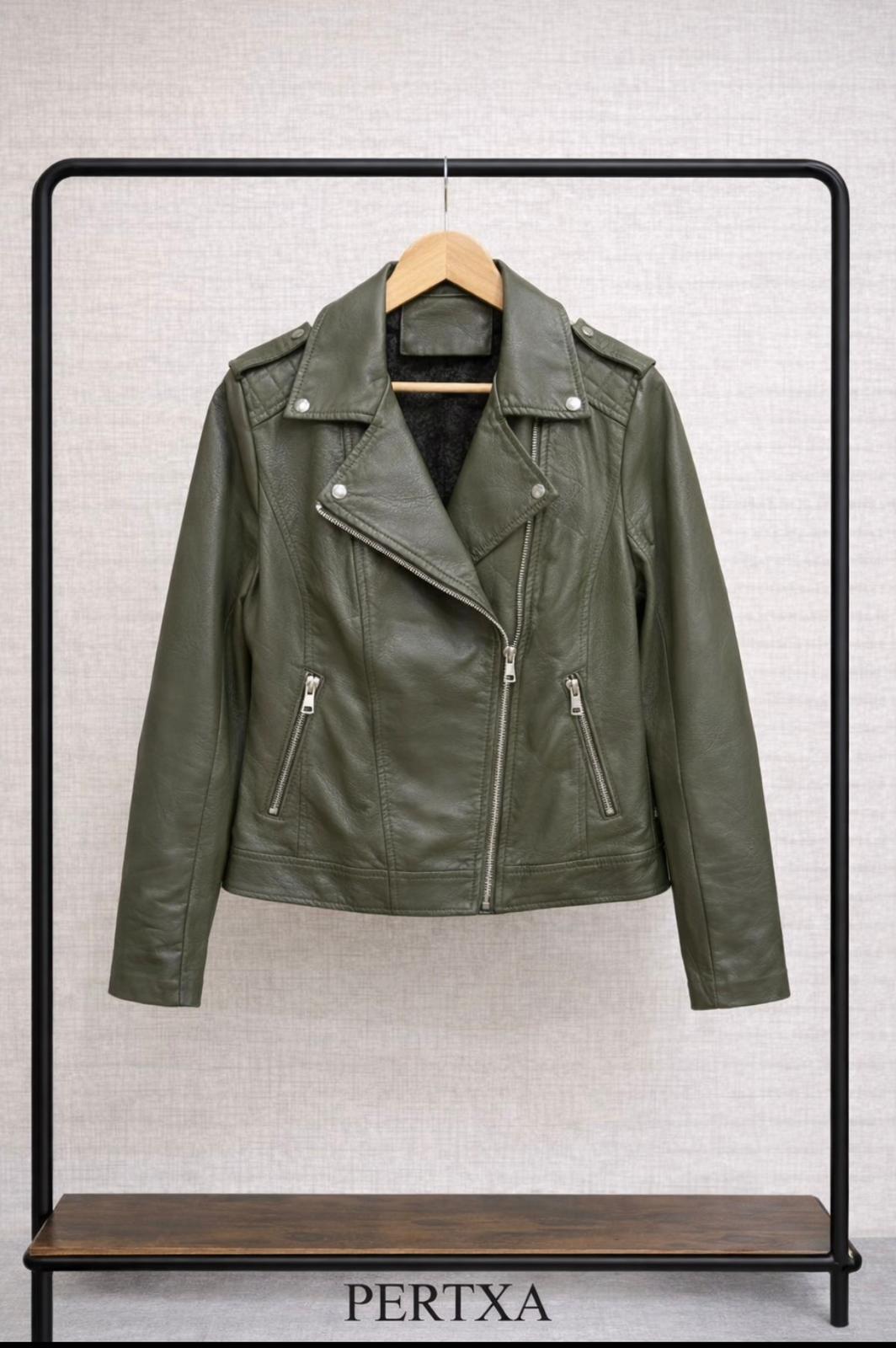 Cazadora de polipiel en color verde con interior forrado en pelo suave, ideal para mantener el calor con estilo. Diseño moderno y versátil, perfecta para completar looks urbanos y dar un toque de color a cualquier conjunto. Disponible en varias tallas.