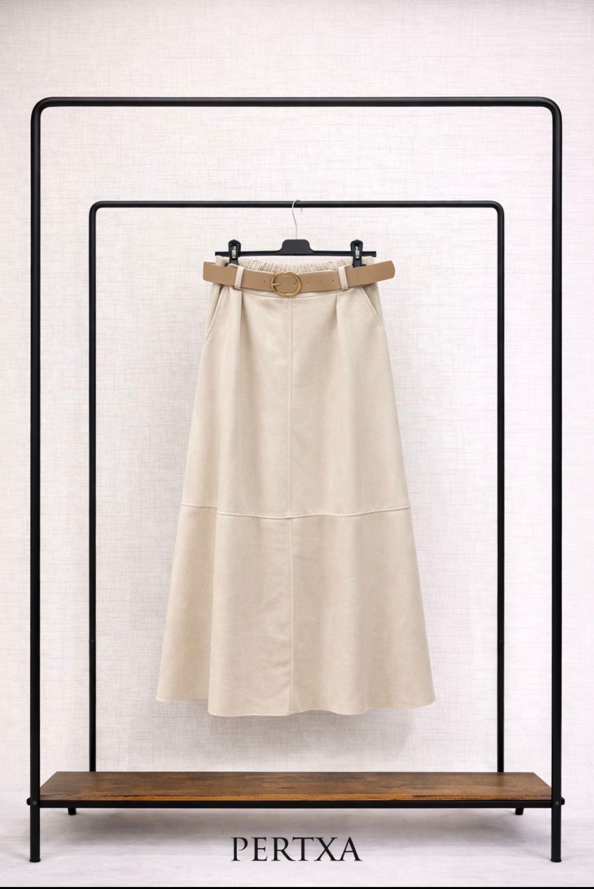Descubre la falda midi de antelina con cinturón, una prenda elegante y versátil que combina comodidad y estilo en un diseño atemporal. Su favorecedor corte evasé estiliza la silueta, aportando movimiento y un ajuste perfecto para cualquier ocasión.