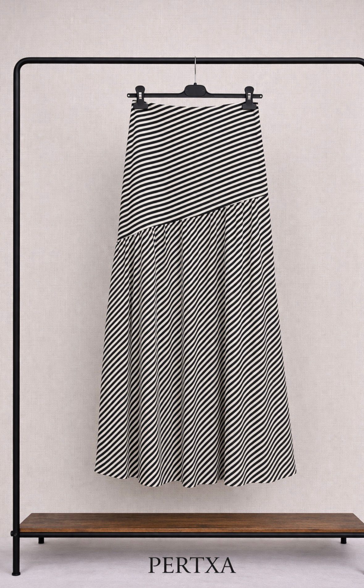 Aporta frescura y estilo a tu look con esta elegante falda de rayas. Confeccionada en una suave mezcla de viscosa y nylon, ofrece una caída ligera y fluida que estiliza la silueta y brinda máxima comodidad durante todo el día.