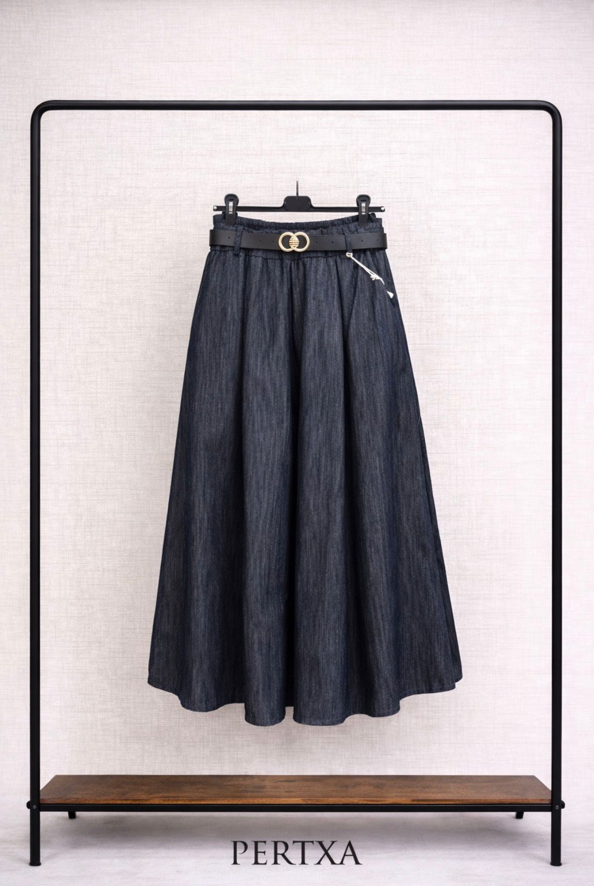 Falda vaquera evasé de corte midi, diseñada para ofrecer comodidad y estilo en el día a día. Incorpora prácticos bolsillos y una cintura engomada en la parte trasera que garantiza un ajuste perfecto y mayor confort. Su silueta favorecedora aporta movimiento y versatilidad, convirtiéndola en una prenda ideal tanto para looks casuales como para outfits más cuidados.