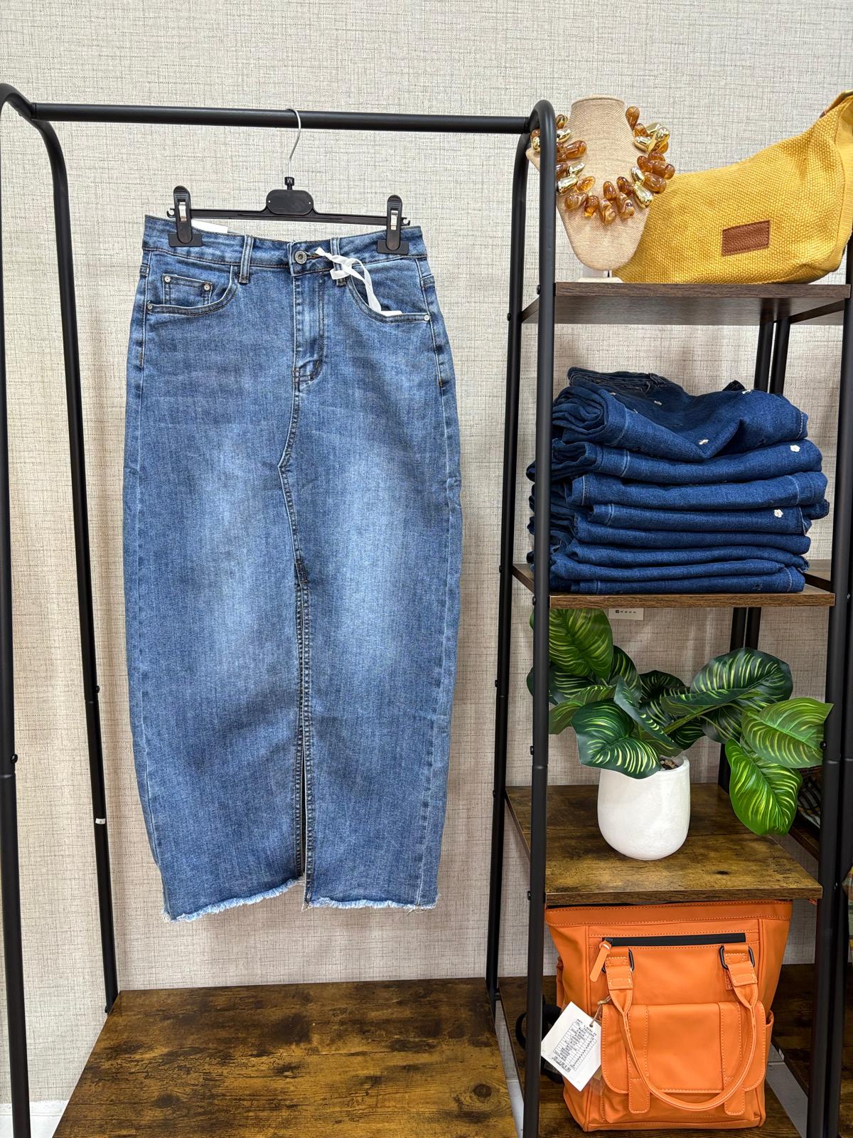 Falda vaquera de corte midi, confeccionada en tejido denim resistente y cómodo, ideal para el uso diario. Su diseño incorpora una abertura central que aporta libertad de movimiento y un toque actual al conjunto.