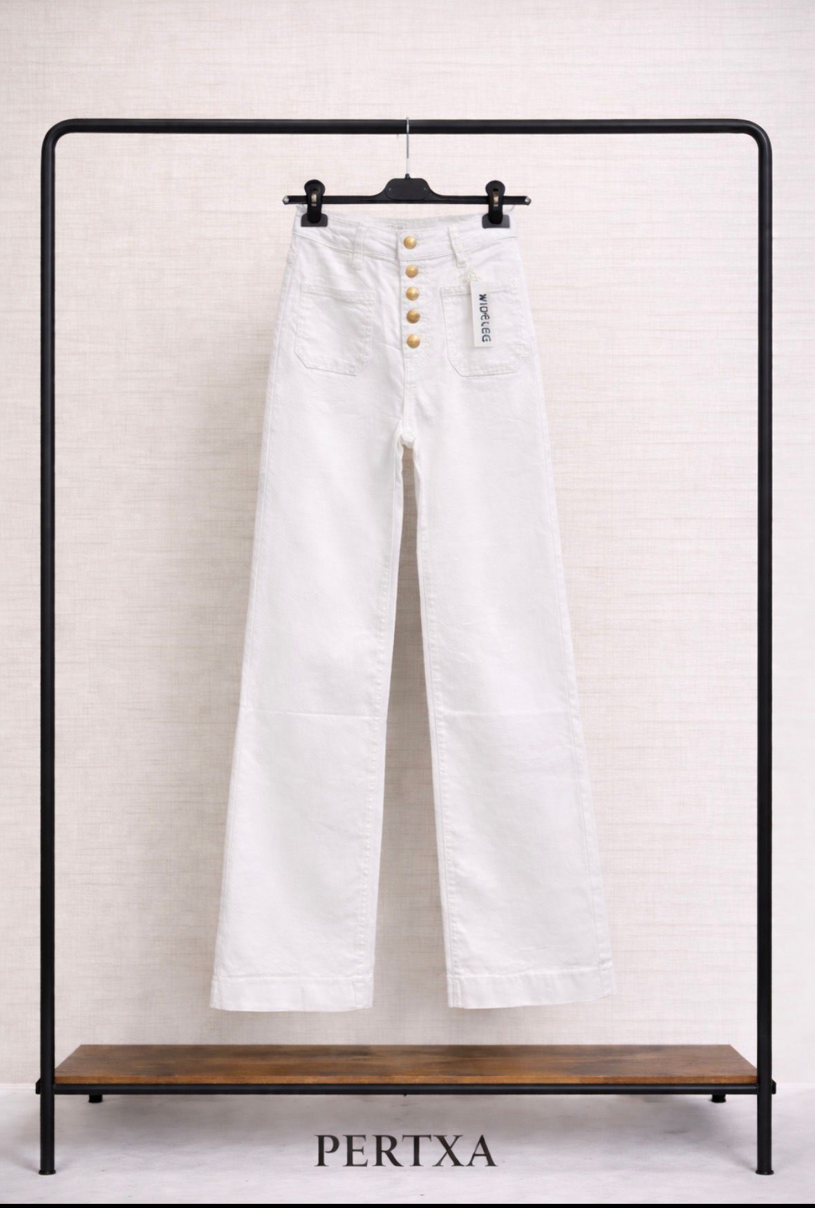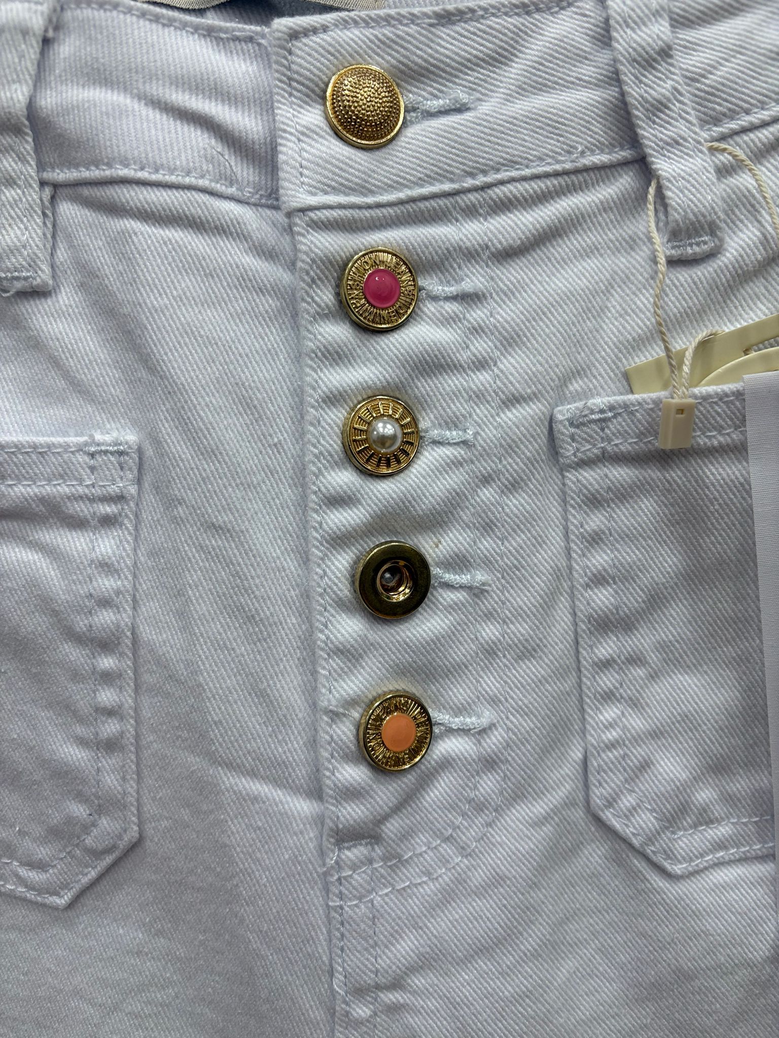 Pantalón blanco de diseño elegante con exclusivos botones joya que aportan un toque sofisticado y diferencial. Confeccionado en tejido altamente elástico, se adapta perfectamente a la silueta ofreciendo máxima comodidad y efecto moldeador. Ideal para looks versátiles, desde outfits casual hasta combinaciones más formales.
