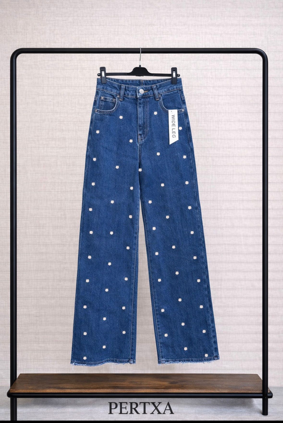 Vaquero ancho de corte recto con flores bordadas en la parte delantera, que aportan un toque femenino y original.
